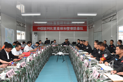 ??? 圖為中國(guó)第四支駐利比里亞維和警察防暴隊(duì)黨總支書(shū)記、政委徐曉偉(右一)主持召開(kāi)聯(lián)創(chuàng)“三心”黨建座談會(huì)