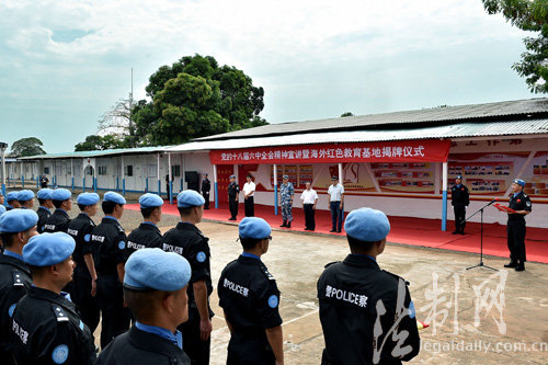 ????揭牌儀式上,中國第四支駐利比里亞維和警察防暴隊政委徐曉偉宣讀了公安部邊防管理局黨委書記、政委牟玉昌專門發(fā)來的賀電,向防暴隊成立海外紅色教育基地表示熱烈祝賀,充分肯定了防暴隊取得的成績,并要求武裝頭腦、指導實踐、推動工作,牢固樹立“四個意識”,嚴肅黨內政治生活,以更加出色的成績和過硬作風為全國邊防官兵作好表率。