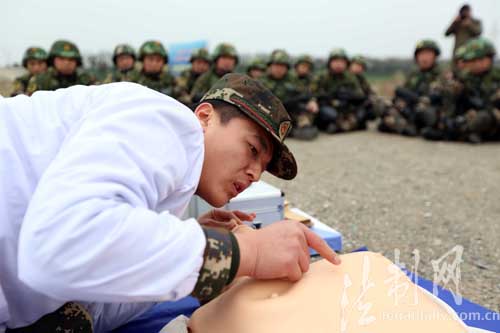 圖為在第一個休息點(diǎn)開展戰(zhàn)場救護(hù)科目教學(xué)