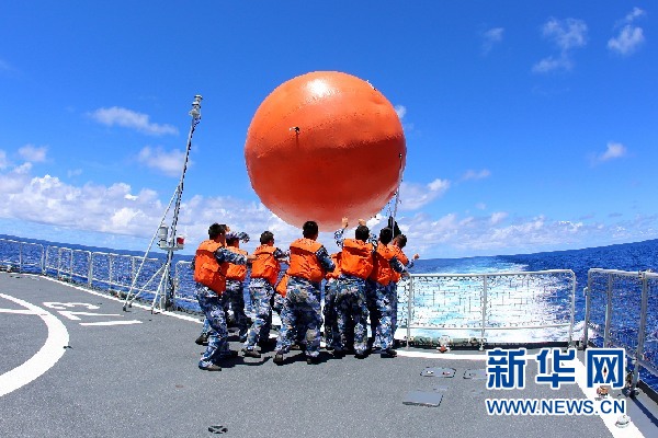 2月19日,在海上現(xiàn)場(chǎng)反擊演練中,長(zhǎng)沙艦艦員在飛行甲板上向指定海域布放模擬“敵艦”的漂浮靶標(biāo)。