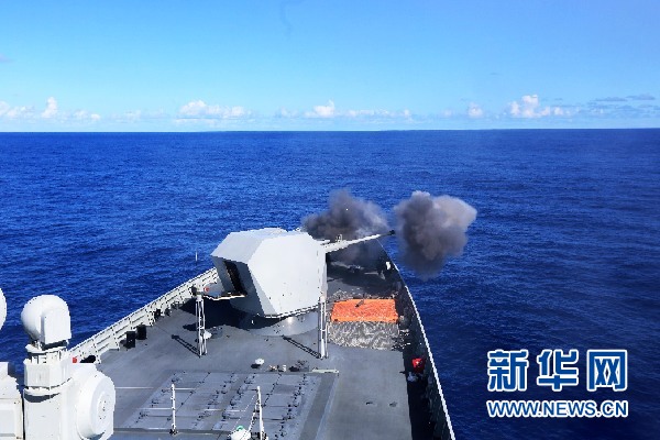 2月19日,在海上現(xiàn)場(chǎng)反擊演練中,長(zhǎng)沙艦對(duì)“敵艦”進(jìn)行主炮火力射擊。