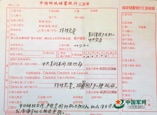 而2012年那筆匯款的辦理員馬慧對“中共黨員”還有印象。她說,老人很客氣,寫附言時還跟她提到國家正在改造建設的航空母艦,很興奮的樣子。辦完業(yè)務,老人還遞過來一張紙條,上面寫著:請?zhí)嫖冶C?,謝謝!