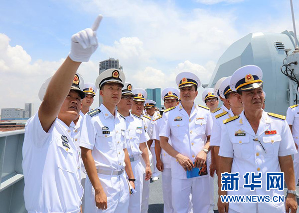 當?shù)貢r間上午10時,編隊導彈驅(qū)逐艦長春艦、導彈護衛(wèi)艦荊州艦緩緩靠上胡志明市西貢港碼頭。越南海軍為編隊到訪舉行了歡迎儀式。儀式結(jié)束后,部分越南海軍官兵、使領館工作人員、中資機構、留學生及華人華僑代表參觀了長春艦。