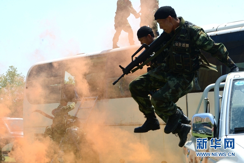 特勤隊(duì)官兵對藏匿在公共汽車內(nèi)的“歹徒”進(jìn)行突擊。
