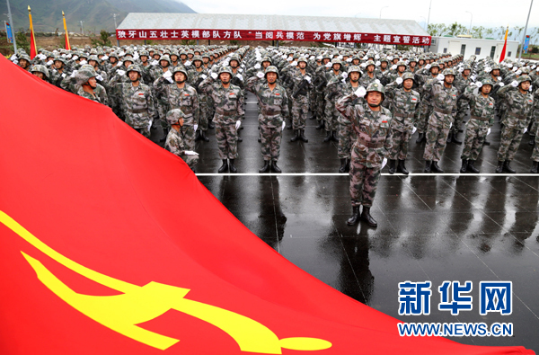 2015年勝利日大閱兵訓(xùn)練期間,“狼牙山五壯士”英模部隊方隊組織宣誓活動(2015年6月29日攝)。新華社發(fā)