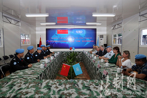 圖為維和警察防暴隊(duì)與聯(lián)利團(tuán)任務(wù)支持部主任大衛(wèi)·約翰·彭克利斯一行開展座談交流
