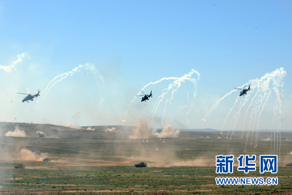 “和平使命-2014”聯(lián)合軍演中,原陸軍第38集團(tuán)軍某紅軍團(tuán)突擊分隊(duì)在陸航掩護(hù)下沖擊目標(biāo)陣地 (2014年8月26日攝)。新華社發(fā)
