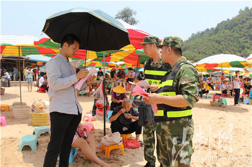 ????在天氣越來越熱的夏季,“海邊游”受到越來越多游客的追捧和青睞。尤其正值暑期,許多游客選擇帶小孩到海邊避暑。為使游客玩得舒心和盡興,廣西公安邊防總隊(duì)防城港邊防支隊(duì)江山邊防派出所針對夏季旅游景點(diǎn)溺水、小孩走失等易發(fā)多發(fā)的實(shí)際,組織官兵深入轄區(qū)景點(diǎn)開展安全宣傳活動(dòng)。