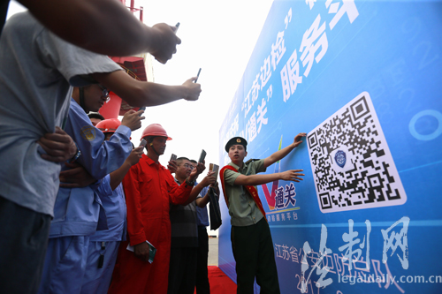 ????8月18日,江蘇邊防總隊(duì)鹽城邊防檢查站在大豐港集裝箱碼頭開展了“江蘇邊檢”微信公眾號(hào)推廣活動(dòng),演示“V通關(guān)”服務(wù)流程,解答服務(wù)對(duì)象提問。
