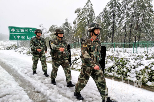 圖為北極邊防派出所官兵冒雪巡邏,防止外來游客及轄區(qū)群眾發(fā)生險情