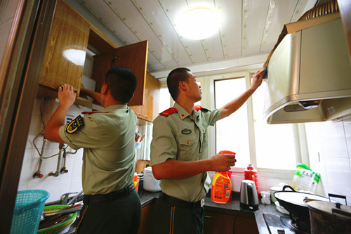 圖為江蘇鎮(zhèn)江邊防檢查站臨退老兵為老人擦拭廚房碗柜、油煙機