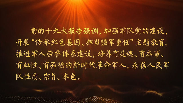 黨的十九大報告強調(diào),加強軍隊黨的建設(shè),開展“傳承紅色基因、擔當強軍重任”主題教育,推進軍人榮譽體系建設(shè),培養(yǎng)有靈魂、有本事、有血性、有品德的新時代革命軍人,永葆人民軍隊性質(zhì)、宗旨、本色。