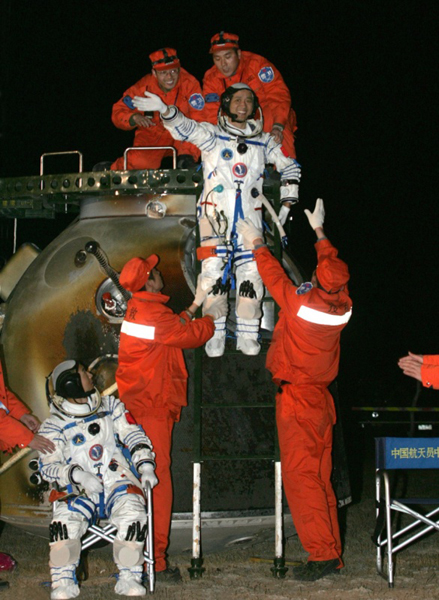 ????2008年9月28日,神舟七號返回地球,航天員翟志剛、劉伯明、景海鵬(從左至右)自主出艙后向現(xiàn)場搜救人員揮手致意。新華社記者 王建民 攝