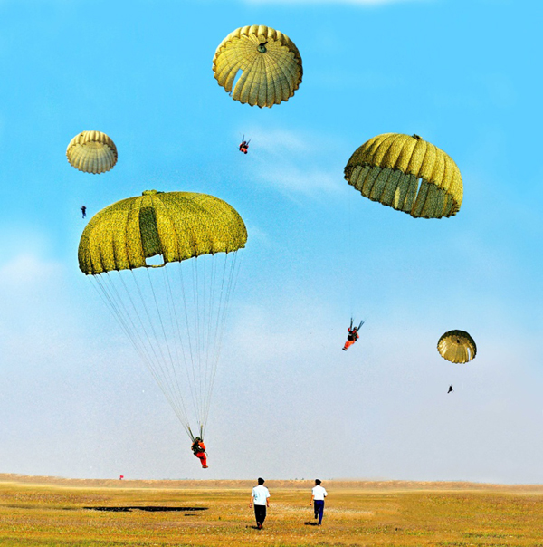 ????2001年6月,航天員在湖北進行跳傘訓(xùn)練。新華社發(fā)(朱九通 攝)
