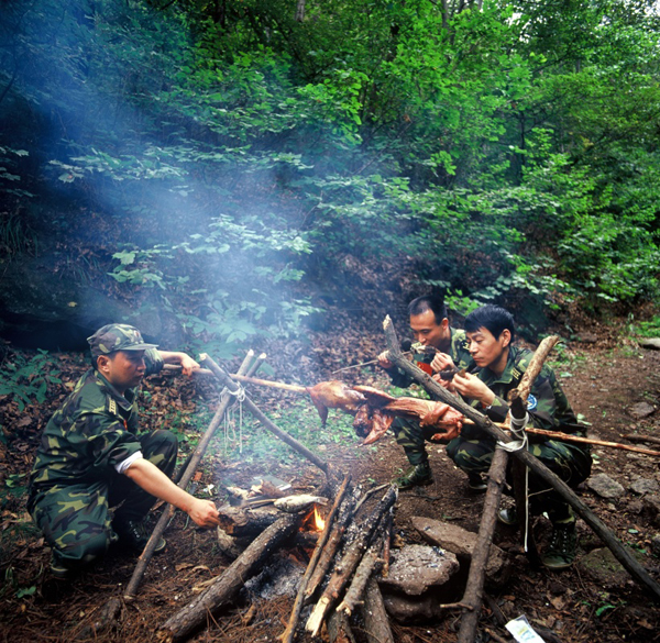 ????2006年9月16日,航天員費俊龍(中)在遼寧進行叢林野外生存訓(xùn)練。新華社發(fā)(朱九通 攝)