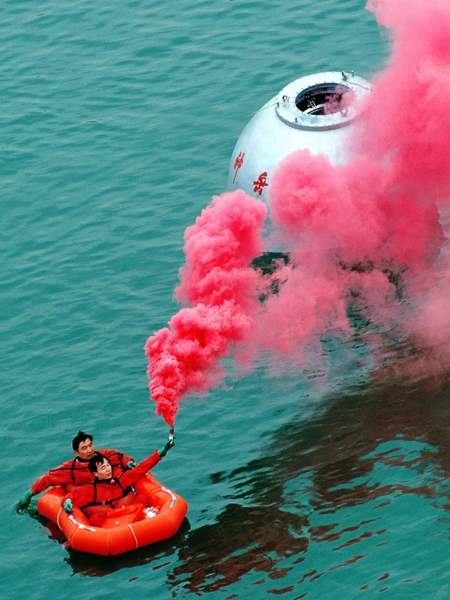 ????2006年12月26日,航天員景海鵬(前)、吳杰進行水上出艙訓(xùn)練。新華社發(fā)(朱九通 攝)
