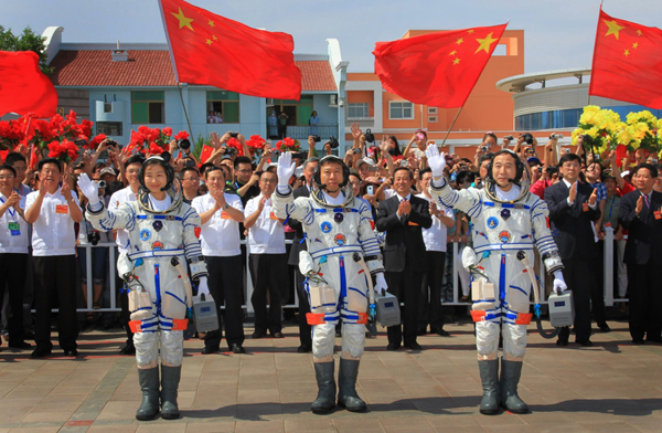 ????2012年6月16日,神舟九號(hào)航天員出征儀式在酒泉衛(wèi)星發(fā)射中心航天員公寓問天閣舉行,航天員景海鵬、劉旺、劉洋(從右至左)向歡送人群揮手致意。新華社記者 李剛 攝