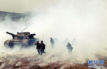 ????在一次實(shí)兵演習(xí)中,“王杰班”所在連隊(duì)官兵配合坦克突入“敵”一線陣地(2014年10月16日攝)。新華社發(fā)(王磊 攝)