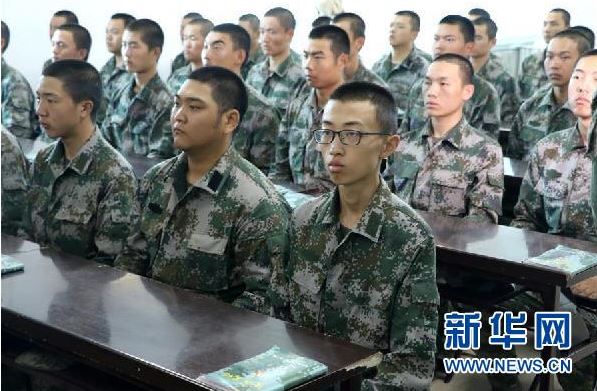 ????資料圖片: 2017年10月2日,在駐守在遼東半島的第79集團(tuán)軍某旅新兵營,蔚晨陽(前右一)在認(rèn)真聽課。新華社發(fā)(王立軍 攝)