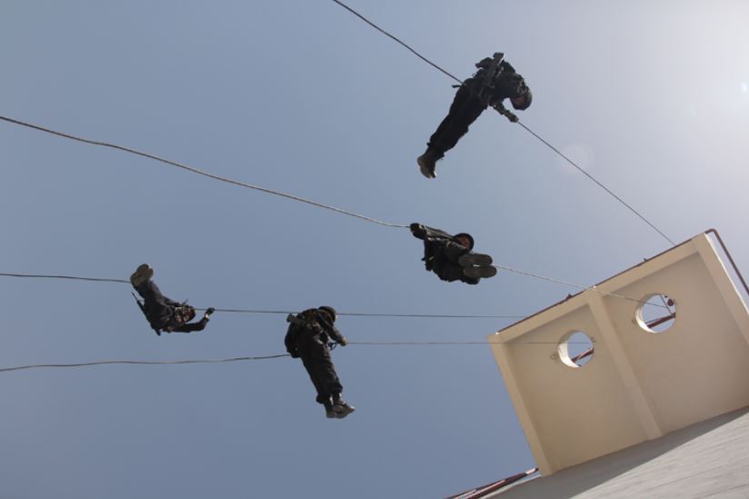 ????資料圖片:武警新疆總隊(duì)四支隊(duì)特勤中隊(duì)進(jìn)行樓房索降訓(xùn)練。新華社發(fā)(楊皓 攝)