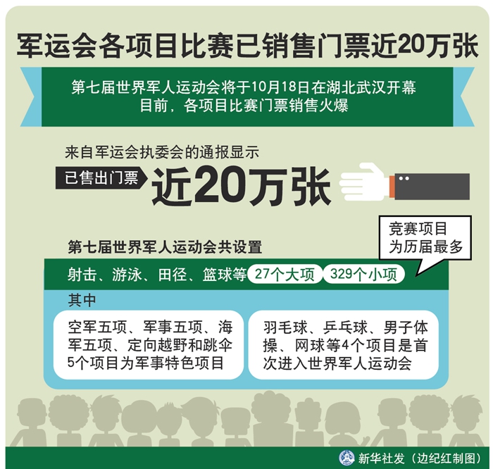 新華社武漢10月16日電(記者梁建強)第七屆世界軍人運動會將于18日在湖北武漢開幕。目前,各項目比賽門票銷售火爆。來自軍運會執(zhí)委會的通報顯示,已售出門票近20萬張。