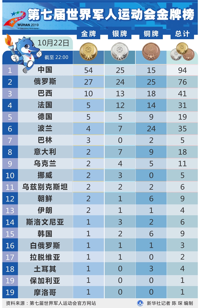 22日比賽結(jié)束后,中國(guó)軍團(tuán)以54金25銀15銅繼續(xù)位居金牌榜和獎(jiǎng)牌榜第一,俄羅斯隊(duì)以27金24銀25銅位居金牌榜和獎(jiǎng)牌榜次席,巴西隊(duì)以10金13銀18銅排在金牌榜和獎(jiǎng)牌榜第三。