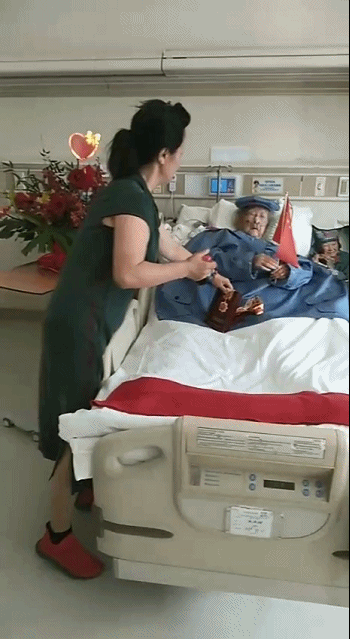 2019年10月1日,中華人民共和國(guó)迎來(lái)七十華誕。素來(lái)了解老人心思的陽(yáng)瓊仙,專門帶了兩面國(guó)旗到病房里。閱兵開始后,滿頭銀發(fā)的王定國(guó)半躺在病床上,一手拿一面旗,隨著軍樂(lè)的節(jié)奏來(lái)回?fù)]舞,累了,歇一下,又接著揮,仿佛自己正身處天安門廣場(chǎng)熱情歡呼的人群中。