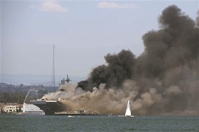 ????發(fā)生火災(zāi)后,處于撲救滅火狀態(tài)的“好人理查德”號(hào)兩棲攻擊艦。