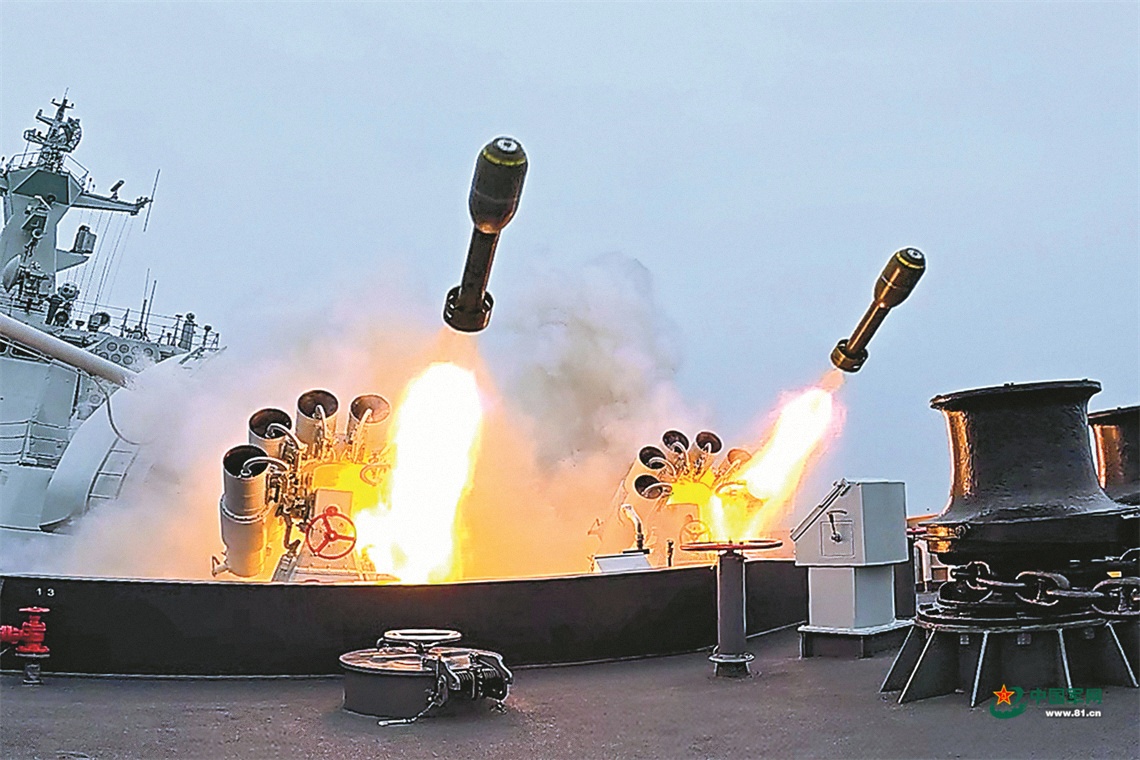 紧张的救援行动刚刚结束,水下威胁突至。声呐战位经过仔细侦听,精准判明回波信息,迅疾捕捉到可疑目标。指挥员下达打击指令,刹那间火光冲天,火箭深弹直扑目标海域……