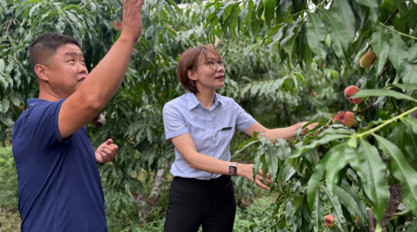 邮储银行张家港市塘桥镇支行行长杨丹深入凤凰镇桃园,了解桃农收成几何,进一步探索农户资金需求。新华网梁栋飞 摄
