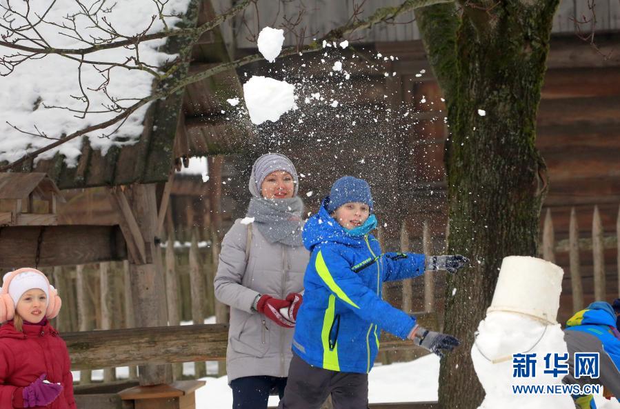 1月24日,孩子們?cè)诎锥砹_斯首都明斯克郊區(qū)的民族建筑博物館內(nèi)打雪仗。新華社發(fā)(任科夫攝)