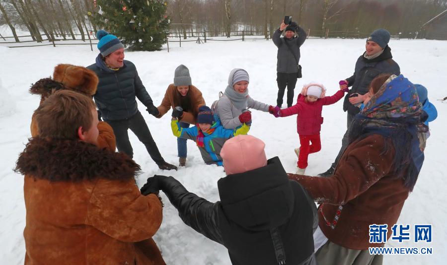 1月24日,人們在白俄羅斯首都明斯克郊區(qū)的民族建筑博物館內圍成圈跳舞。新華社發(fā)(任科夫攝)