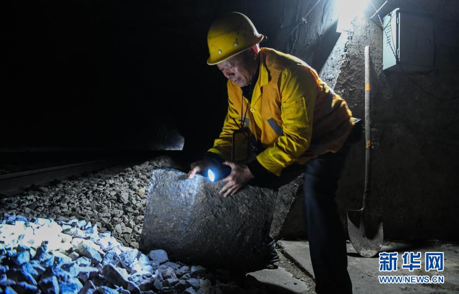 在廣西河池境內黔桂鐵路線上的鄧山隧道,中國鐵路南寧局集團有限公司柳州工務段的4名看守工輪換值班,依靠手電筒在黑暗中穿行,及時巡查隧道中可能出現(xiàn)的各種隱患,確保每天經隧道運行的59趟客貨列車春運安全。鄧山隧道全長773米,是一個需要人員全天候看守的鐵路隧道。