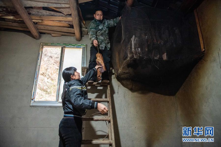 1月29日,在湖南省瀘溪縣浦市鎮(zhèn)麻溪口村,武中翠和丈夫取臘肉。