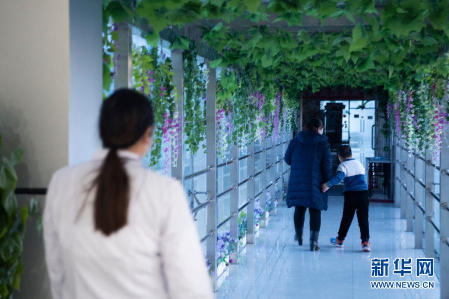 在哈爾濱博能中醫(yī)門診部,劉雨晴(左)在結(jié)束一天的康復(fù)訓(xùn)練后目送腦癱兒童離開(kāi)(2月2日攝)。