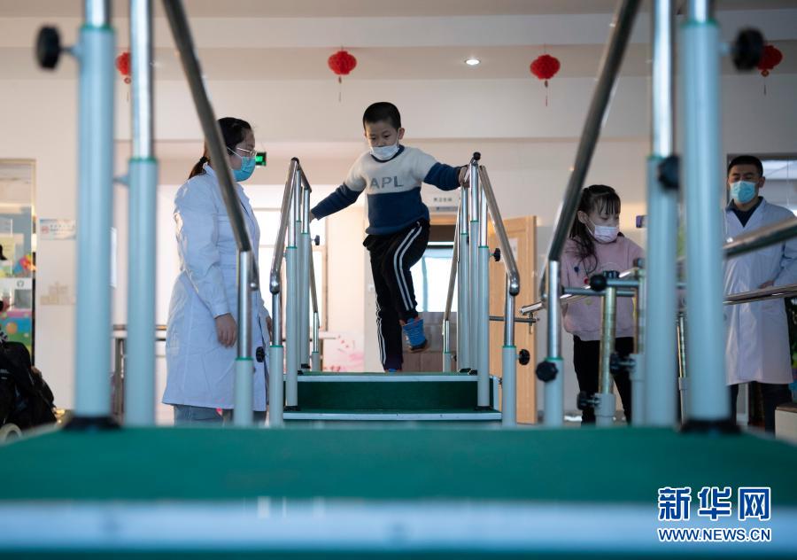 在哈爾濱博能中醫(yī)門診部,劉雨晴(左一)為腦癱兒童進(jìn)行康復(fù)訓(xùn)練(2月2日攝)。