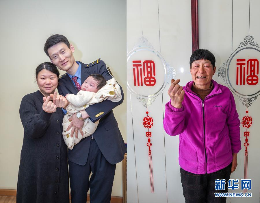 拼版照片:左圖為2月10日,在重慶市渝中區(qū)的家中,付寶印抱著兒子和妻子孫夢潔比出心形手勢(新華社記者 黃偉 攝);右圖為2月9日,付寶印的母親鐘士輝在吉林省長春市農(nóng)安縣楊樹林鄉(xiāng)牛尾巴山村家中比出心形手勢(新華社記者 張楠 攝)。