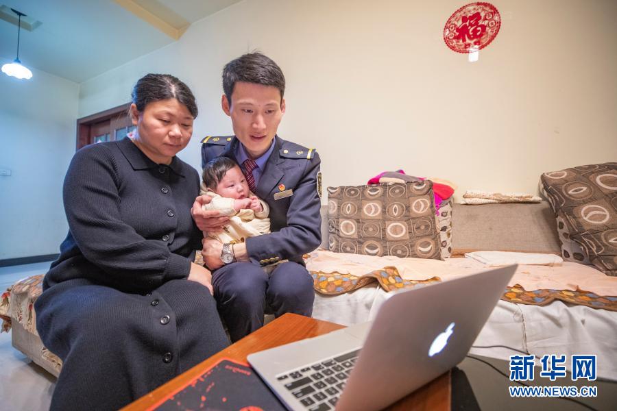 2月10日,在重慶市渝中區(qū)的家中,付寶印與妻子孫夢潔一起抱著兒子同吉林老家的母親視頻通話。新華社記者 黃偉 攝