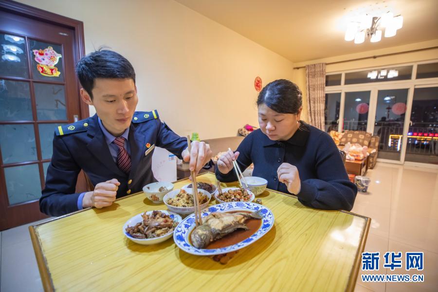 2月10日,付寶印與妻子孫夢(mèng)潔在重慶市渝中區(qū)家中吃晚飯。新華社記者 黃偉 攝
