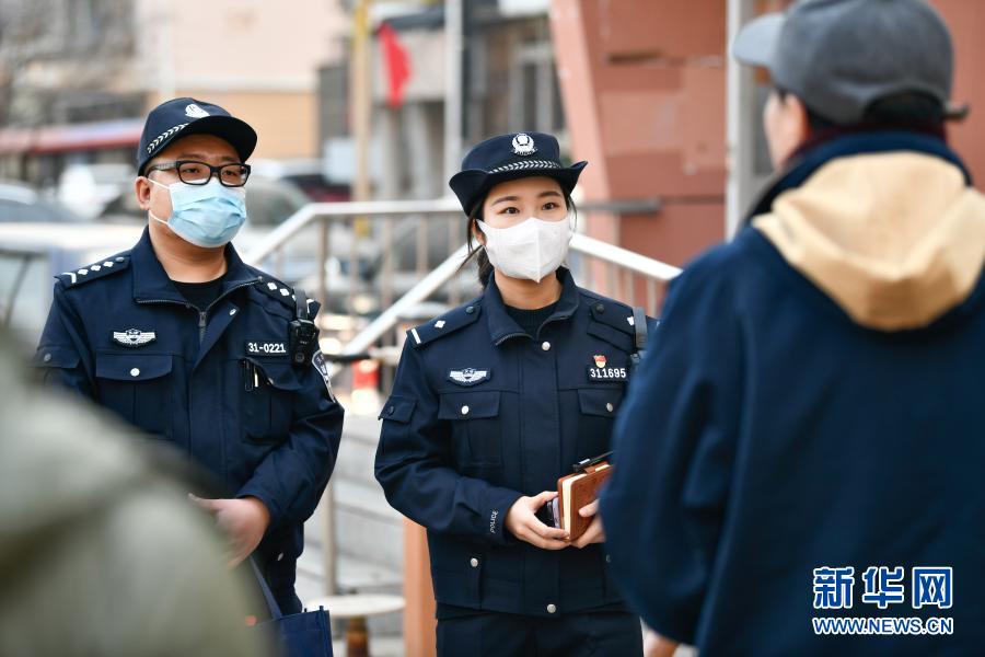 2月11日,在天津市紅橋區(qū)隆春里社區(qū),楊曉惠(中)與輔警郝旭(左)向晨練的社區(qū)居民問(wèn)詢(xún)社區(qū)情況。新華社發(fā)(孫凡越攝)