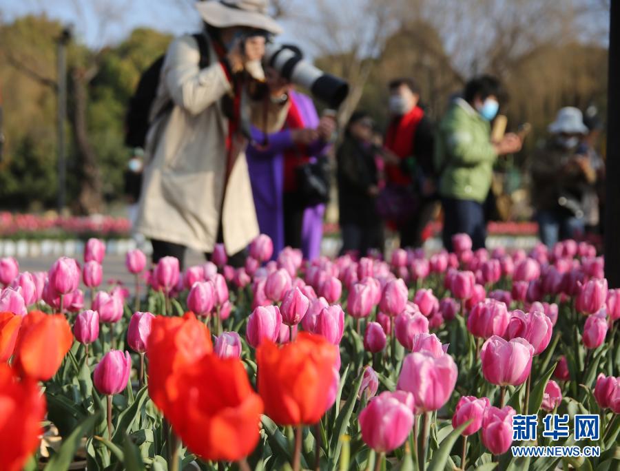 2月14日,游客在昆明市大觀(guān)公園拍攝盛開(kāi)的郁金香。新華社發(fā)(梁志強(qiáng) 攝)