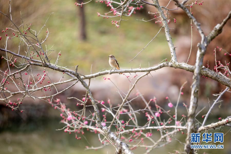 2月14日,在江蘇揚(yáng)州瘦西湖湖畔,一只小鳥(niǎo)在梅枝上停歇。新華社發(fā)(齊立廣 攝)