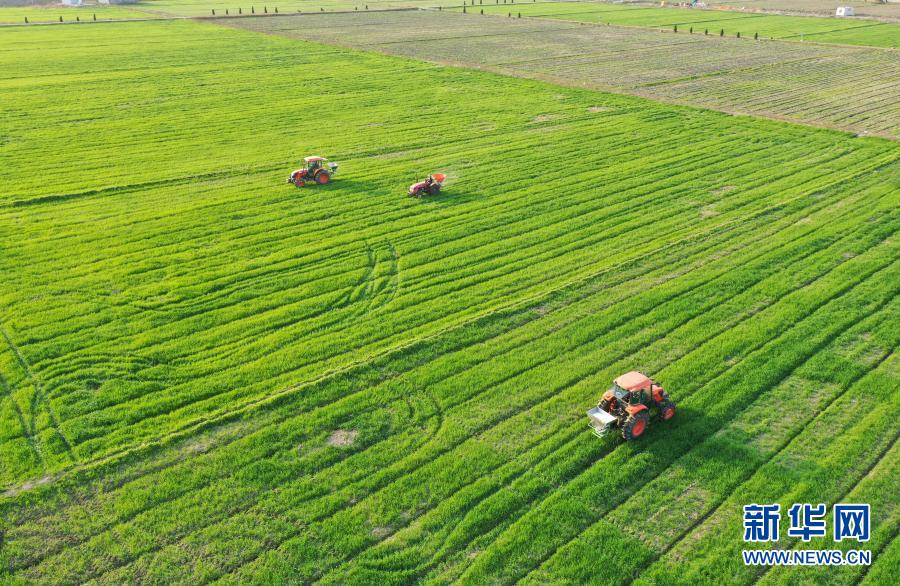 2月23日,湖州錢山下糧油專業(yè)合作社工作人員駕駛農(nóng)機(jī)在田間給小麥?zhǔn)┓剩o人機(jī)照片)。立春過后氣溫回升,浙江省湖州市吳興區(qū)道場鄉(xiāng)全力開展春耕工作。今年該鄉(xiāng)計劃播種農(nóng)作物總面積1.2萬畝,其中水稻5000畝、小麥2000畝。新華社記者 翁忻旸 攝