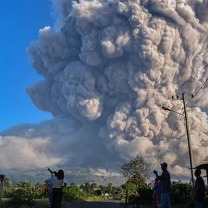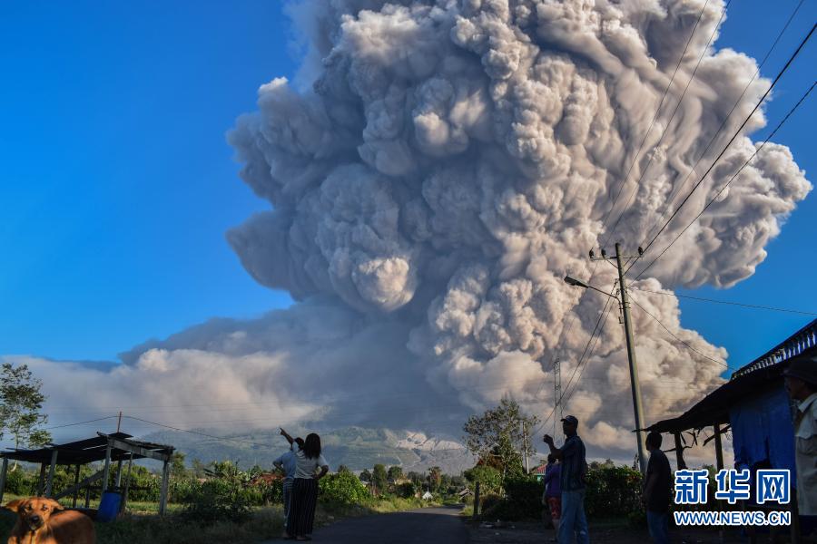 3月2日,人們?cè)谟《饶嵛鱽啽碧K門(mén)答臘省卡羅觀看噴發(fā)的錫納朋火山。新華社發(fā)(森比林?jǐn)z)
