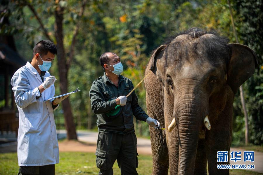 “象爸爸”為一頭名叫“小強(qiáng)”的大象測(cè)量胸圍(3月6日攝)。新華社記者 江文耀 攝