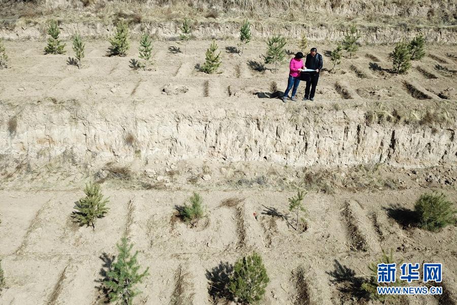 3月11日,在平?jīng)鍪嗅轻紖^(qū)白水鎮(zhèn)焦莊村北山,張文玉(左)和同事討論植樹造林細(xì)節(jié)(無人機(jī)照片)。