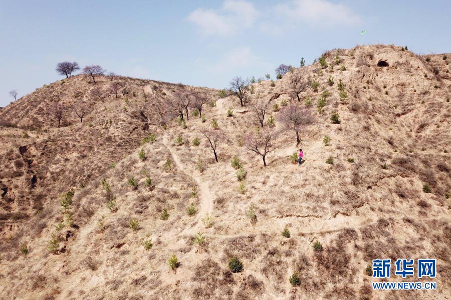 3月11日,在平?jīng)鍪嗅轻紖^(qū)白水鎮(zhèn)焦莊村北山,張文玉在山坡上查看栽植的油松(無人機(jī)照片)。