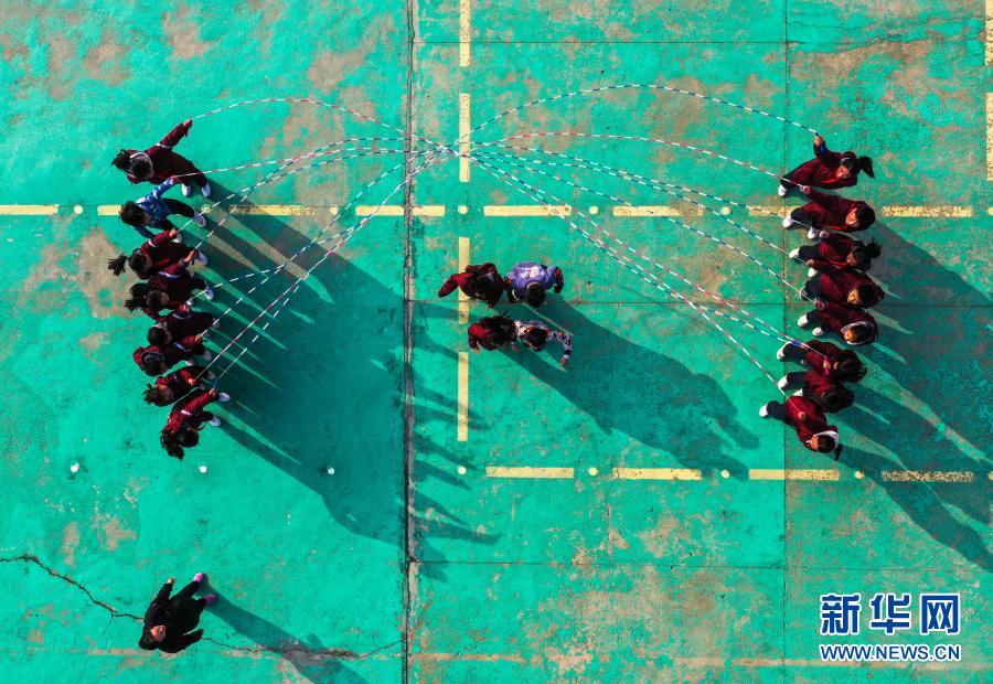 騎路小學(xué)的學(xué)生們在大課間練習(xí)“大網(wǎng)繩跳”(3月10日攝,無人機(jī)照片)。新華社記者 楊磊 攝