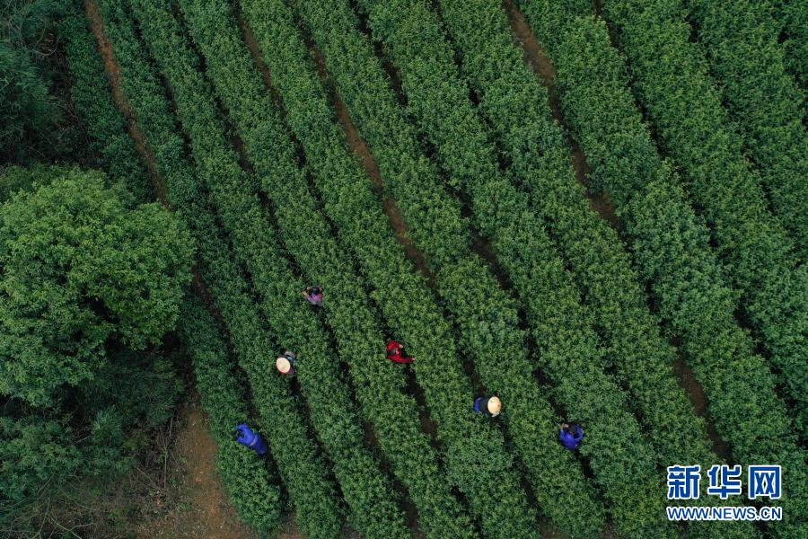 3月20日,采茶工在余杭區(qū)余杭街道竹園村的茶園采摘茶葉(無人機照片)。