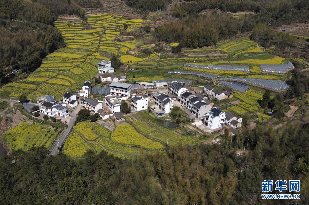 這是3月26日拍攝的花海中的黃山市徽州區(qū)靈山村(無(wú)人機(jī)照片)。